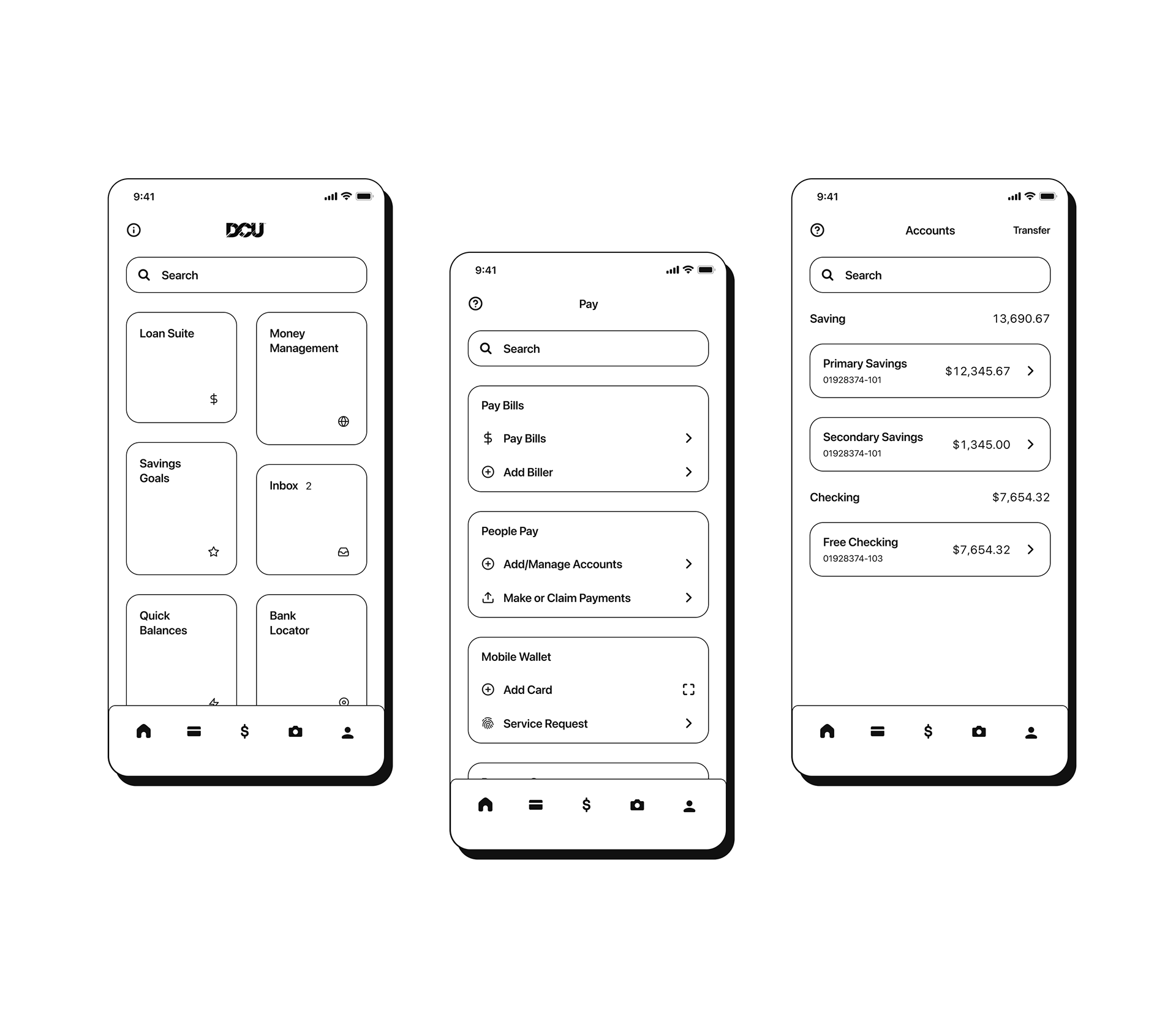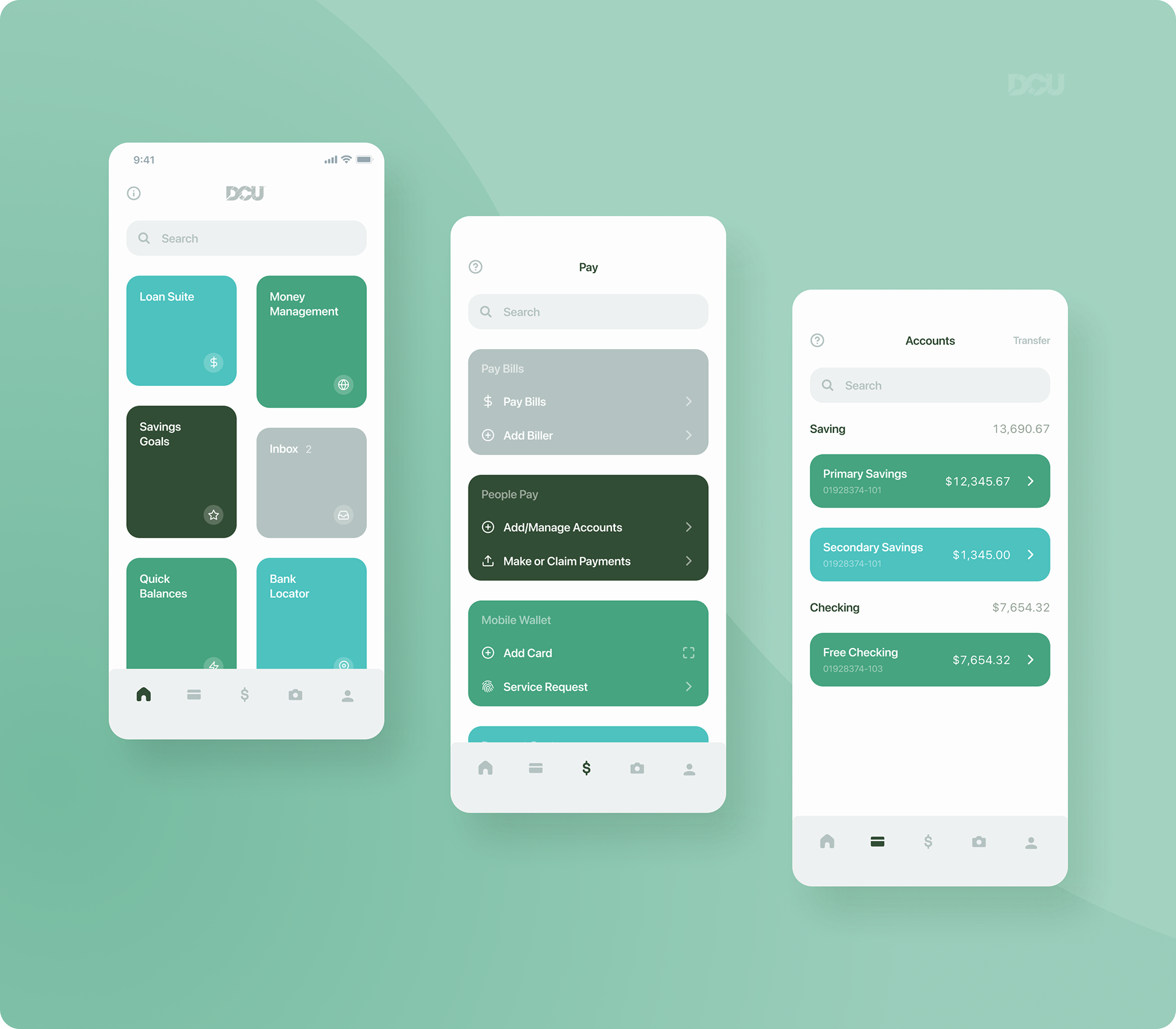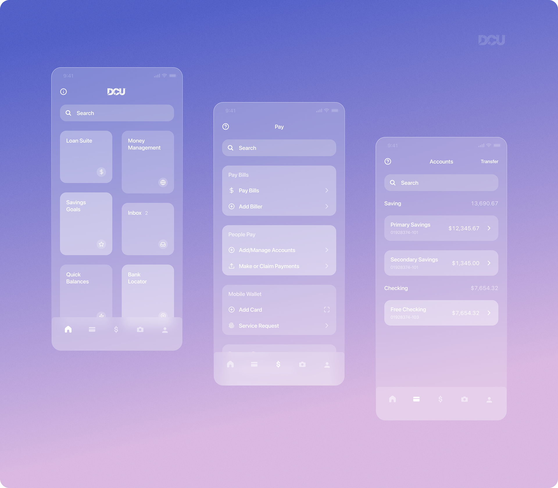 A very surface-level redesign of the DCU Mobile Banking app— I didn't change much about the structure or hierarchy of features here, just wanted to experiment with color and dribbbly-flat-impractical look.